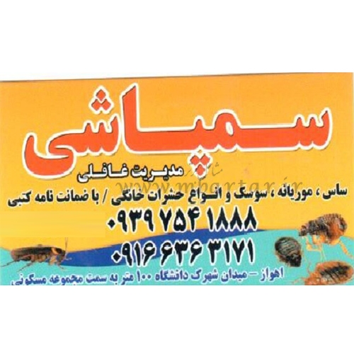 با سلام وعرض ادب خدمت همشهریان عزیز سمپاشی و موریانه زدایی جهت پیشگیری از ایزوله شدن ساختمانها در حال ساخت توسط موریانه و از بین بردن وجود موریانه در ساختمانها و منازل تضمینی و ریشه کن شدن ساس تختخابی فقط با یک بار سمپاشی و از بین بردن سوسک کابینتی و جلو گیری از وجودعقرب،مار،هزارپا،وانواع خزندگان و دارای سابقه کاری در اب برق کل خوزستان و شهرک های اب برق ،شرکت گروه ملی، شرکت ملی حفاری شمال،شرکت مارون ماهشهر، بیمارستان مهر،بیمارستان اپادانا،بیمارستان ارتش 92زرهی مهدکودک ها هتل ها و منازل شخصی استان. تبلیغ نمیکنیم شاغلین شرکتهایه نامبرده که سابقه کاری ما می باشد می توان با تماس و مشاوره رایگان در موردحشرات و اثبات کاری ما در شرکتهایه نامبرده تماس حاصل فرمایند انجام سمپاشی در بیمارستانها نشانه ایمنی بودن و کیفیت کار ما می باشه ادرس دفتر اتوبان گلستان بین میدان فرهنگ شهر و شهرک دانشگاه نرسیده به مجموعه مسکونی خدمات ساختمانی محسنی و برای هماهنگی با تلفن تماس 09166363171یا09397541888حاصل فرمایید