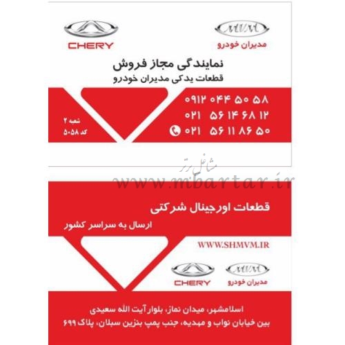 نمایندگی مجاز فروش قطعات محصولات مدیران خودرو وچری ارائه فاکتور رسمی مدیران خودرو ارسال به سراسر کشور آماده همکاری با فروشگاه ها وکلینیک های تخصصی سط کشور قطعات اورجینال شرکتی(بدنه.موتوری.گیربکس)