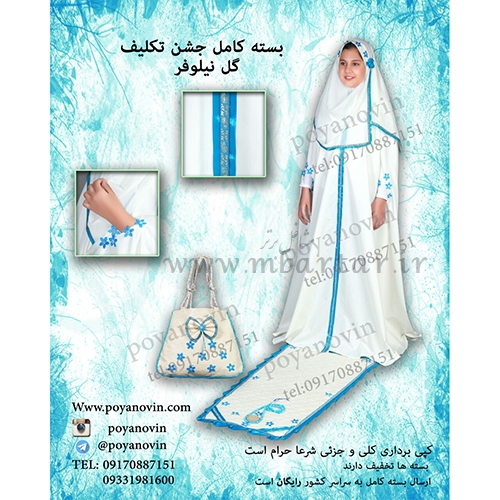 محصولات جشن تکلیف دختران ، شامل :چادر نماز ، جانماز ،کیف ، مهر و تسبیحبسته ها شامل :بسته گل نیلوفربسته گل مریمبسته گل یاسبسته گل بنفشهوبسایت👇 www.poyanovin.comتلگرام👇https://t.me/poyanovin اینستاگرام👇https://www.instagram.com/PoyaNovin