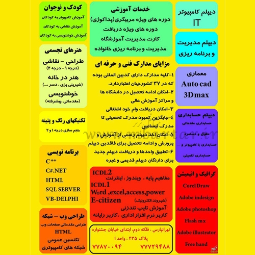 آموزشگاه شمیم دانش : برگزاری کلیه دوره های آموزش کامپیوتر از پایه به صورت کاملا حرفه ای جهت ورود به بازار کار در همه رشته ها شامل : ICDL جامع / کرل و فتوشاپ / اتوکد / تری دی مکس / معماری / شبکه / برنامه نویسی / اندروید / جاوا / تولید محتوا و ....
