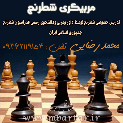 تدریس خصوصی شطرنج توسط داور و مربی و دانشجوی رسمی فدراسیون شطرنج جمهوری اسلامی ایران.از مبتدی تا پیشرفته.با کمترین قیمت.جلسه ی اول رایگان.تلفن تماس:09362119154 آقای رضایی با مدیریت: محمد رضایی