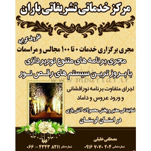 خدمات مجالس باران در ازنا الیگودرز ودرود وبروجرد اجرای ورودی عروس وداماد فرش قرمز ظروف کرایه میزوصندلی وفرش دیس ملامین وریسه پرژکتور اجاره باندو اکو و.... کلیه ظروف یکبار مصرف مجلسی کلیه خدمات عقدوعروسی نورپردازی مجالس رقص نور ولیزر